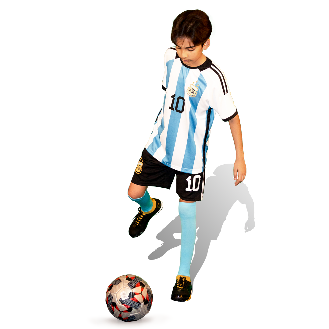 Celebrate the passion and prowess of Argentine soccer with this youth jersey featuring Lionel Messi’s iconic #10. Crafted with the national team’s traditional sky blue and white stripes, this set embodies Argentina’s rich football heritage. The jersey is designed for comfort and style, perfect for young fans who aspire to emulate Messi’s brilliance on the field. Whether worn for training or cheering from the stands, this ensemble proudly showcases Argentina’s enduring legacy in world football