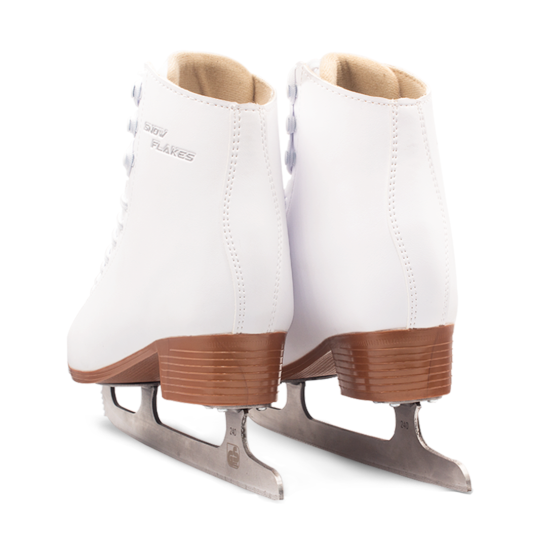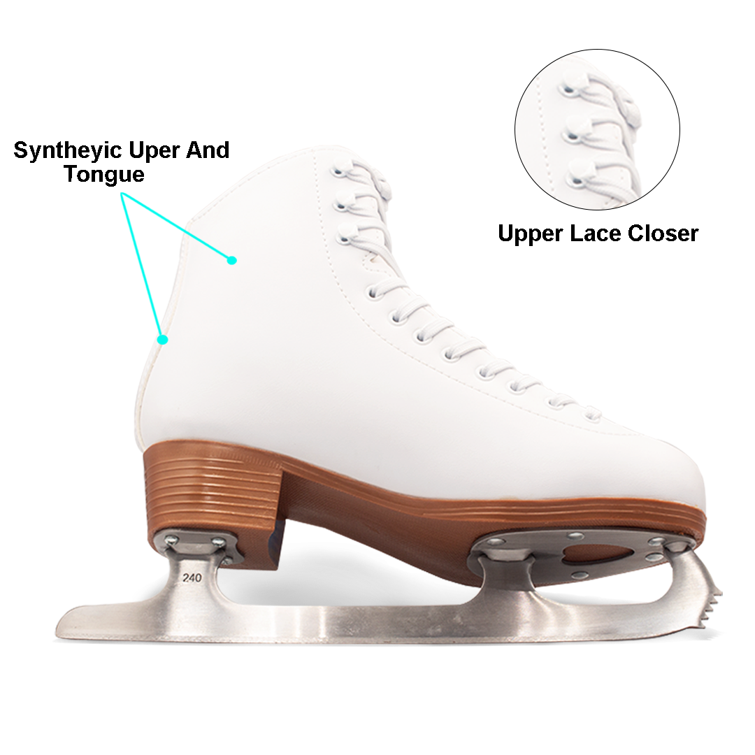 BAUD Ice Skates Figure skates are perfect for beginners learning basic skills, featuring softer topline for added comfort, synthetic lining is comfortable and durable, flex notch for added flexibility, full quarterandextra ankle padding, foam backed comfort tongue, PVC outsole, Ultima Mark II blade.