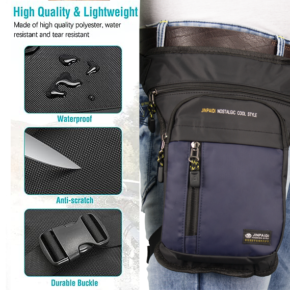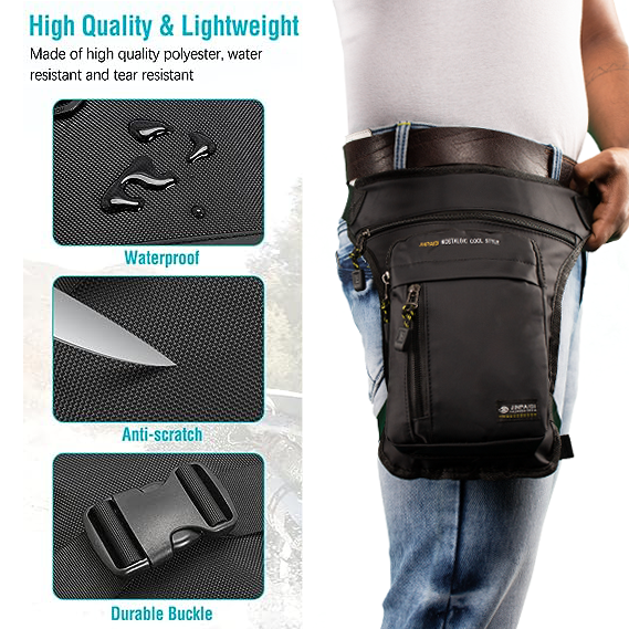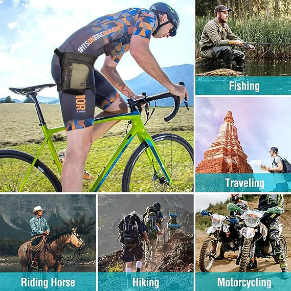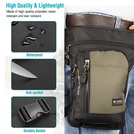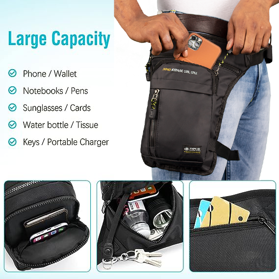 Super Big Capacity The keys and glasses can be hung up to the Carabiner,and the outermost zipper can be opened to expand the room from 2.8L to 5.6L really big capacity. The motorcycle leg bag can store two bottles of water,cash, tickets, passports and cell phone, keeping important items safe while traveling. *Fitment Useful and effective: make your hands free while you are camping, traveling or Driving a motorcycle Fit for outdoor, travel, shopping, beach, Sports, Fashion.Suitable for men and women, adults and kids