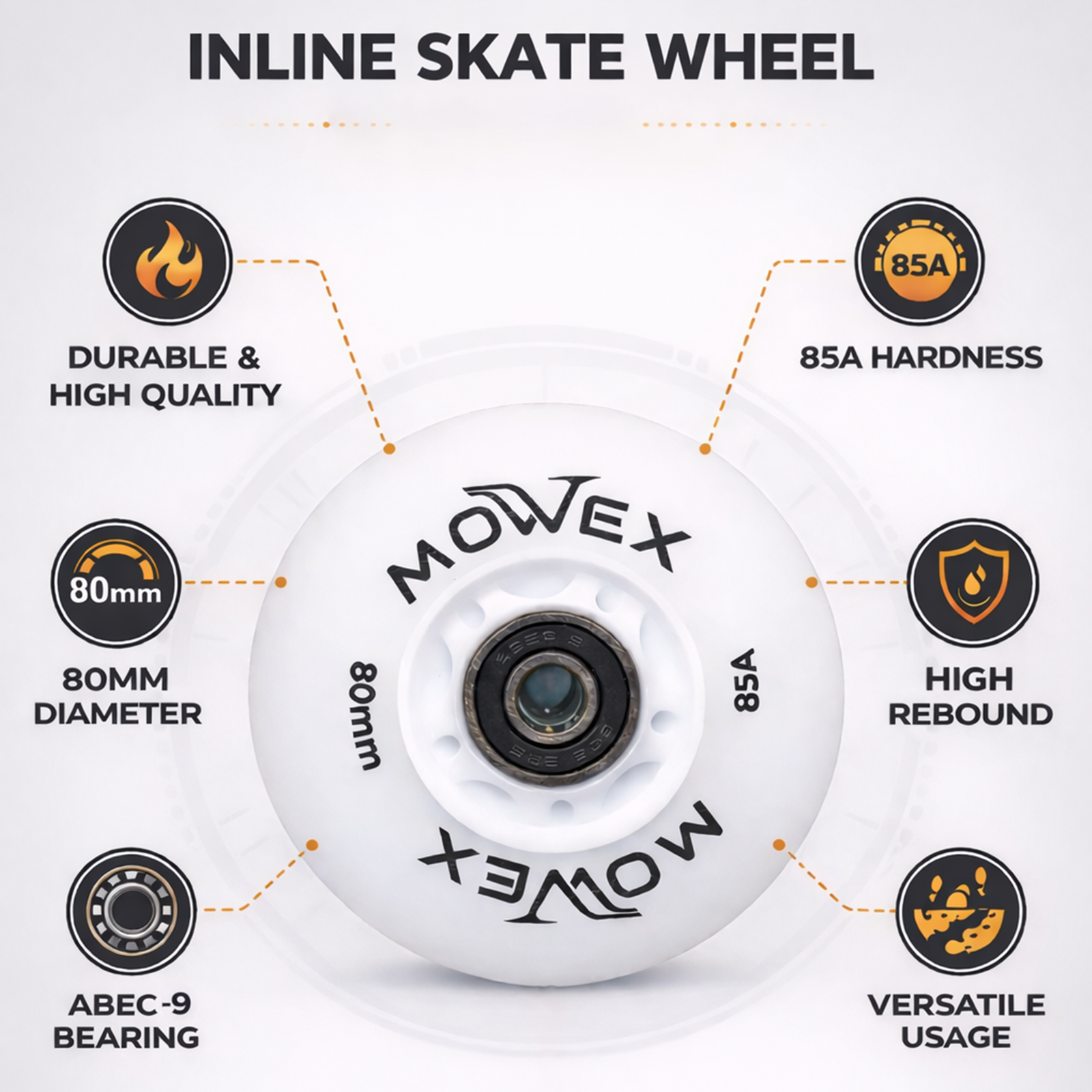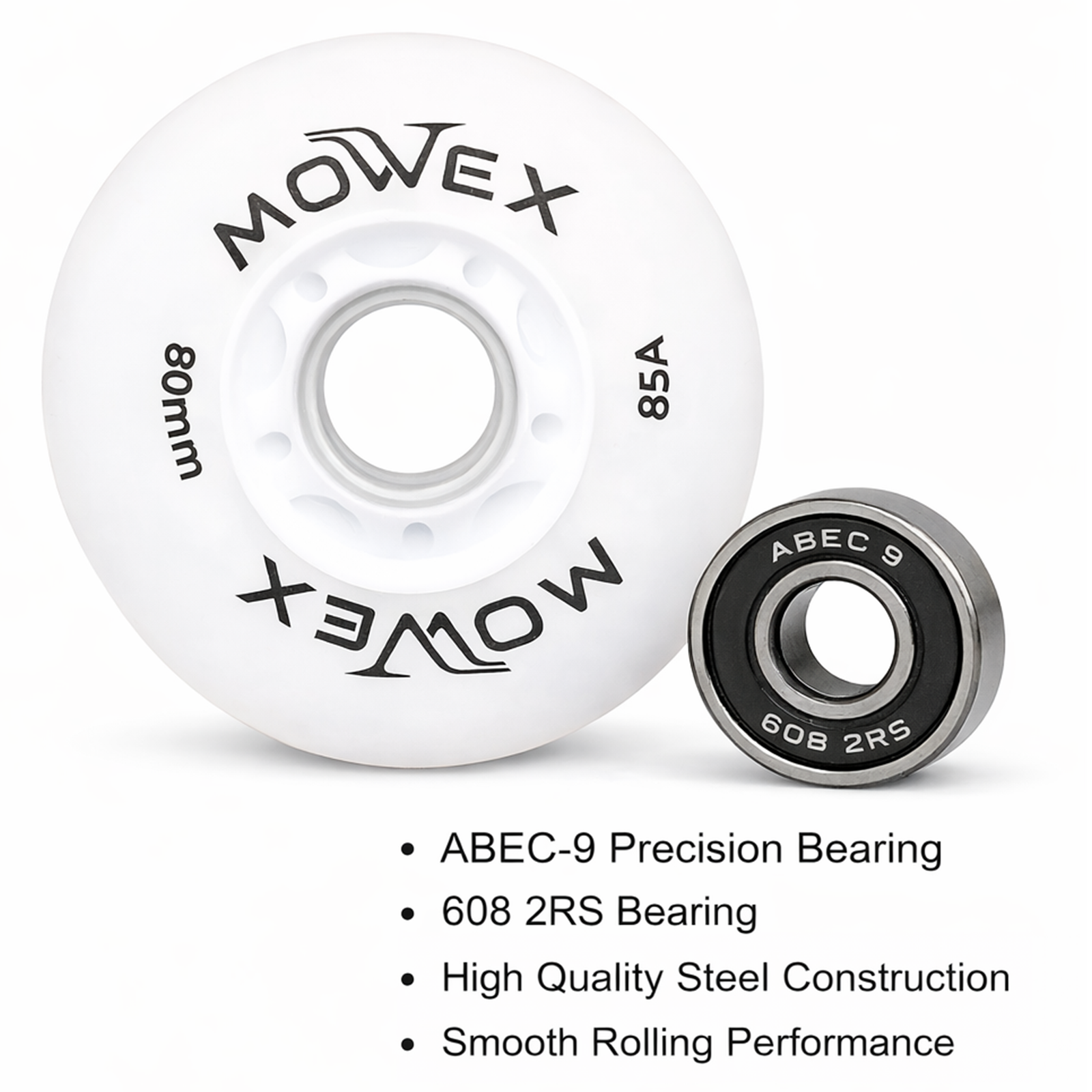 Upgrade your ride with the MOWEX LED Flash Inline Skates Wheels with ABEC-9 Bearings, designed for speed, style, and smooth performance. These 80mm light-up rollerblade wheels deliver bright, colorful LED flashes every time you roll – no batteries required. Perfect for indoor rink skating and outdoor street cruising, this bundle pack gives you premium replacement wheels built for durability, grip, and high-speed control. Crafted from high-rebound PU material, these roller skate wheels provide excellent shock absorption and wear resistance, ensuring a smoother and more stable ride on various surfaces. The included ABEC-9 precision bearings enhance rotation speed and reduce friction for effortless gliding. Whether you’re replacing worn-out wheels or upgrading for better performance, MOWEX LED inline skate wheels bring both functionality and eye-catching style to your skates. Ideal for kids, teens, and adults who want high-performance rollerblade wheels with a vibrant LED glow for night skating, rink sessions, fitness skating, or freestyle fun.