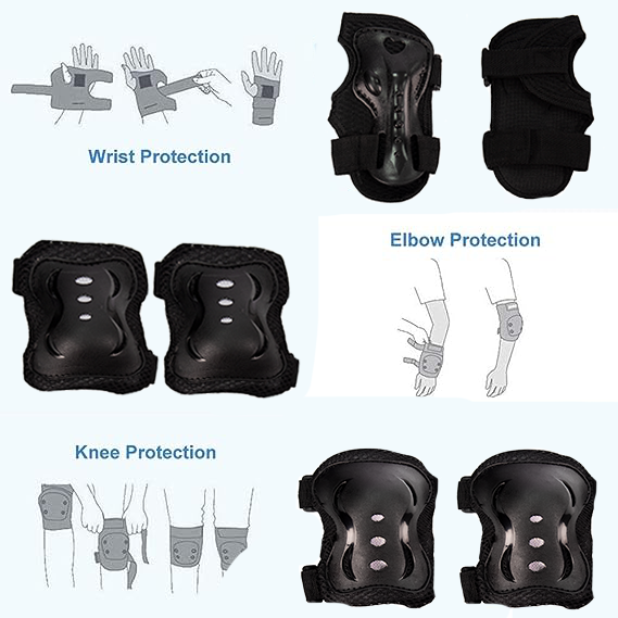 ONE SIZE FITS ALL:Multiple adjustable elastic straps and Velcro closures for secure fit for various knee girths,the knee pads elbow pads with wrist guards could offer custom flexibility what the user desrie,they could choose to hold its tightly to keep their position right when they are riding thier to have breathable air between the pads and body.