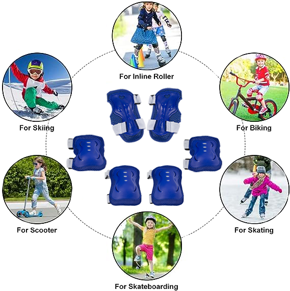 Set of 7 Pieces Helmet,protective elbow, knee and wrist pad. Suitable for kids age 3-12 years old,bring you all-round and perfect protection while doing sports. IMPACT RESISTANT :High hardness PVC shell, thickened soft sponge, absorbent, comfortable and durable,The inner lining adopt high breathable cotton and High-density foam padding for comfort and cooling, sweat uptake, very shockproof, prevent kid from getting injured,cycling experiences with safety protection to their knee elbow and wrist. ONE SIZE FITS ALL:Multiple adjustable elastic straps and Velcro closures for secure fit for various knee girths,the knee pads elbow pads with wrist guards could offer custom flexibility what the user desrie,they could choose to hold its tightly to keep their position right when they are riding thier to have breathable air between the pads and body. USED OF MULTI-SPORTS:Suitable for roller skating, scooters, gokarts, skateboards, cycling and other outdoor sports,Great for ice and roller skating. Lightweight and breathable Kneepads Help You Relieve Patella Pain Wrist pads fix wrists and protect the soft tissues. Elbow pads fix elbows and help you avoid pain. Helmet for Head Safty during outdoor sports Packing Content:2 x Knee pad,2 x Elbow pad,2 x Wrist pad and 1x Helmet Great Gift for Kids It is the good choice as the gift for Christmas, Birthday, Children’s Day,etc. It’s a good present as a children/kids gift. Perfect for any girls and boys.