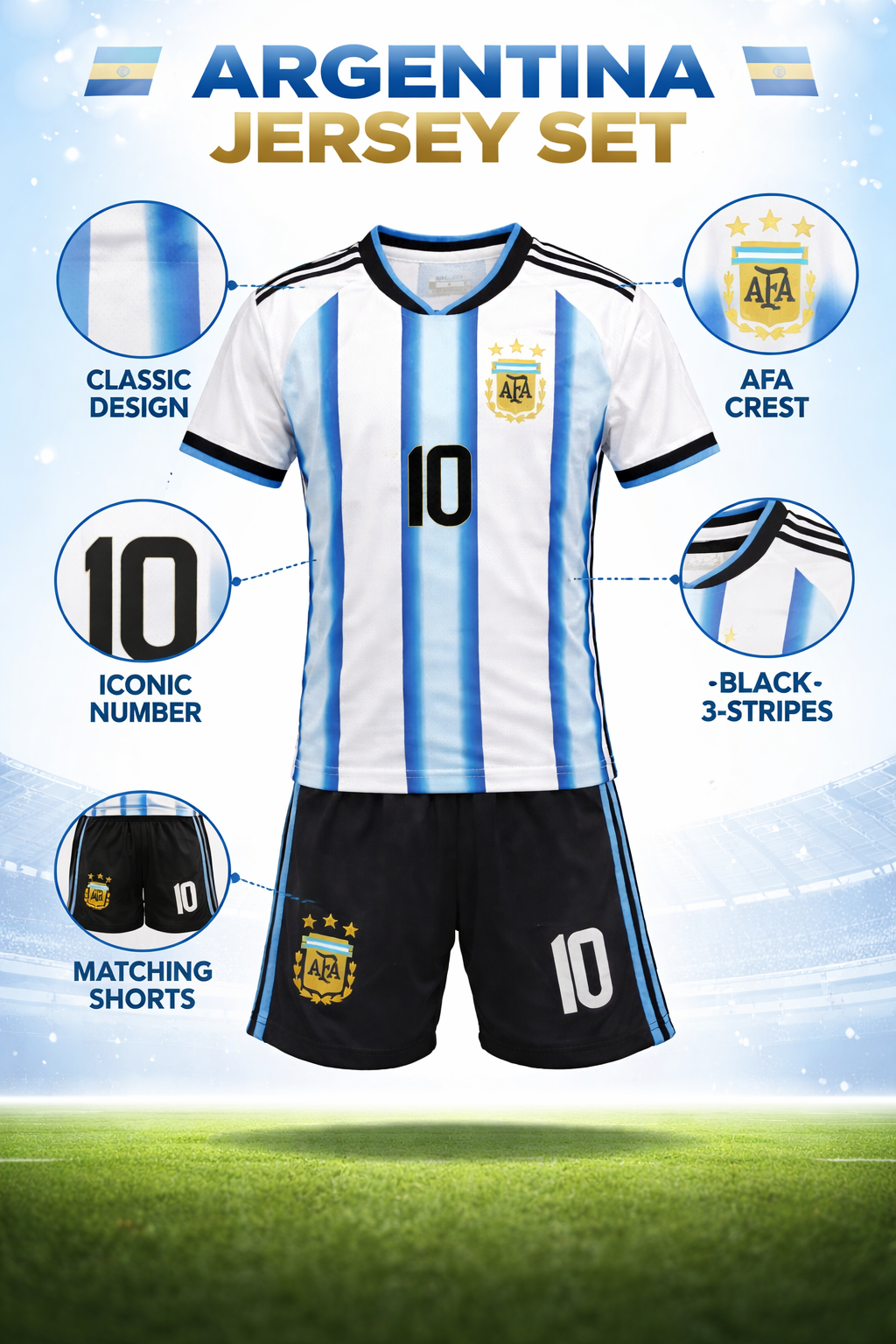 The classic sky blue and white design represents pride, passion, and world-class football excellence. Whether you’re inspired by global stars like Lionel Messi or simply love the Argentina football legacy, this jersey set lets you play with confidence and style.