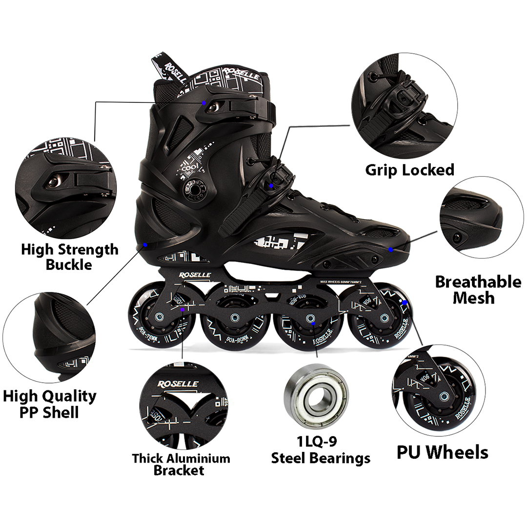 Material Composition and Construction: The Overs Inline Skate Shoes are crafted using PP wear-resistant material, ensuring durability and longevity. High-quality layered mesh fabric is incorporated into the design, offering breathability and moisture-wicking properties to keep feet comfortable during skating sessions. Triple Safety Protection: Equipped with a triple safety protection system to ensure the safety of users, especially children. Features a high-strength buckle, velcro strap, and laces, all designed to withstand hard pressure and securely fasten the skates, providing stability and protection to the feet. Advanced Bearing System: Utilizes ABEC-7 Chrome and Steel bearings, known for their smooth and efficient performance, enhancing the overall skating experience. The bearing system ensures smooth rolling and reduced friction, allowing for effortless gliding on various surfaces. Comfort and Convenience: Designed with adult users in mind, incorporating features to enhance comfort and ease of use. Features a thickened memory sponge mother-of-pearl cloth, providing cushioning and support for extended periods of skating. The refreshing and breathable mesh cloth further enhances comfort by promoting airflow and preventing moisture buildup. Removable design allows for easy cleaning by simply rinsing the skates with water, maintaining hygiene and freshness. Sturdy Frame Construction: Built with an aluminum frame, renowned for its lightweight yet sturdy properties.